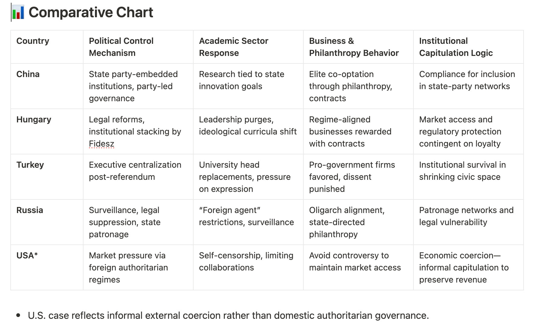 In China, state capitalism and algorithmic governance fuse political control with elite incorporation. Private business leaders often comply with party directives through corporate philanthropy and technology-sharing, cementing their status in regime-aligned networks (Taylor & Francis Online, Academia, ResearchGate). Universities and research institutions function within a system of brokered dependency, where access to funding and academic prestige depends on loyalty to state ideology. Autonomous research agendas are de-prioritized in favor of state-aligned innovation goals (SAGE Journals, arXiv). Institutions capitulate not under physical coercion, but through intertwined economic incentives, bureaucratic dependence, and embedded institutional norms that favor regime alignment over autonomy.